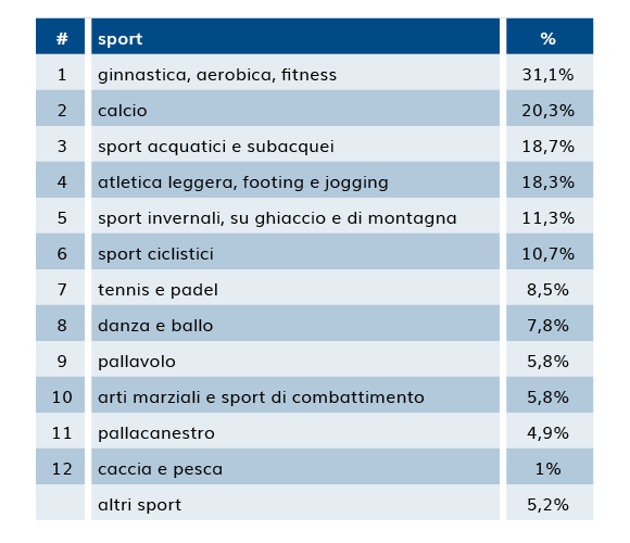 Al primo posto (31,1%) ci sono gli sport tipicamente “da palestra” (ginnastica, aerobica e fitness), seguiti dall’immancabile calcio (20,3%, ma in costante calo anno dopo anno), con gli sport acquatici (18,7%) e quelli legati alla corsa (18,3%) che si contendono il quarto posto.
